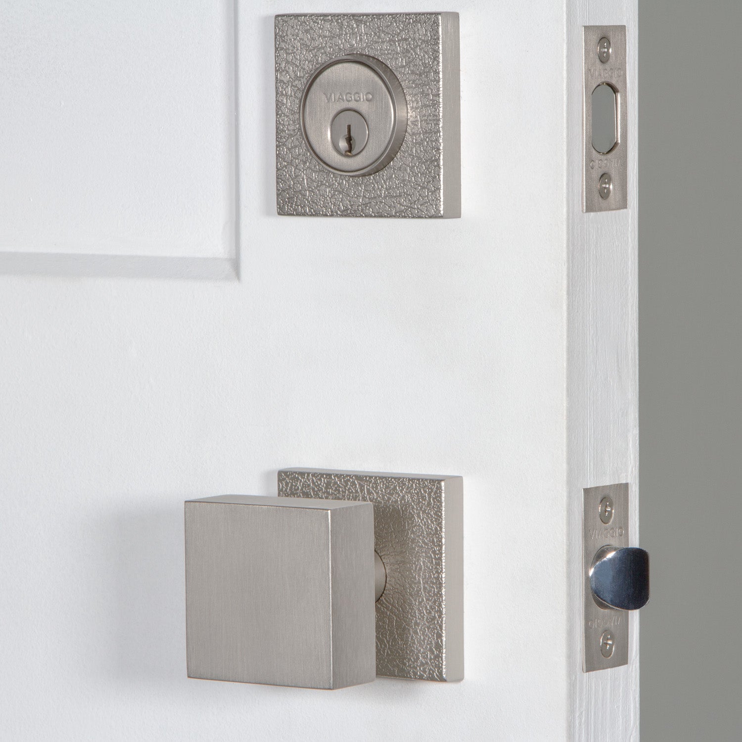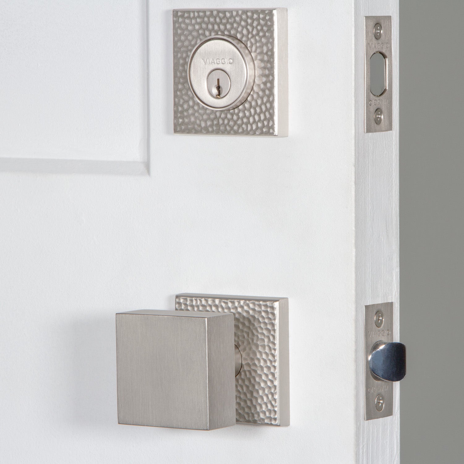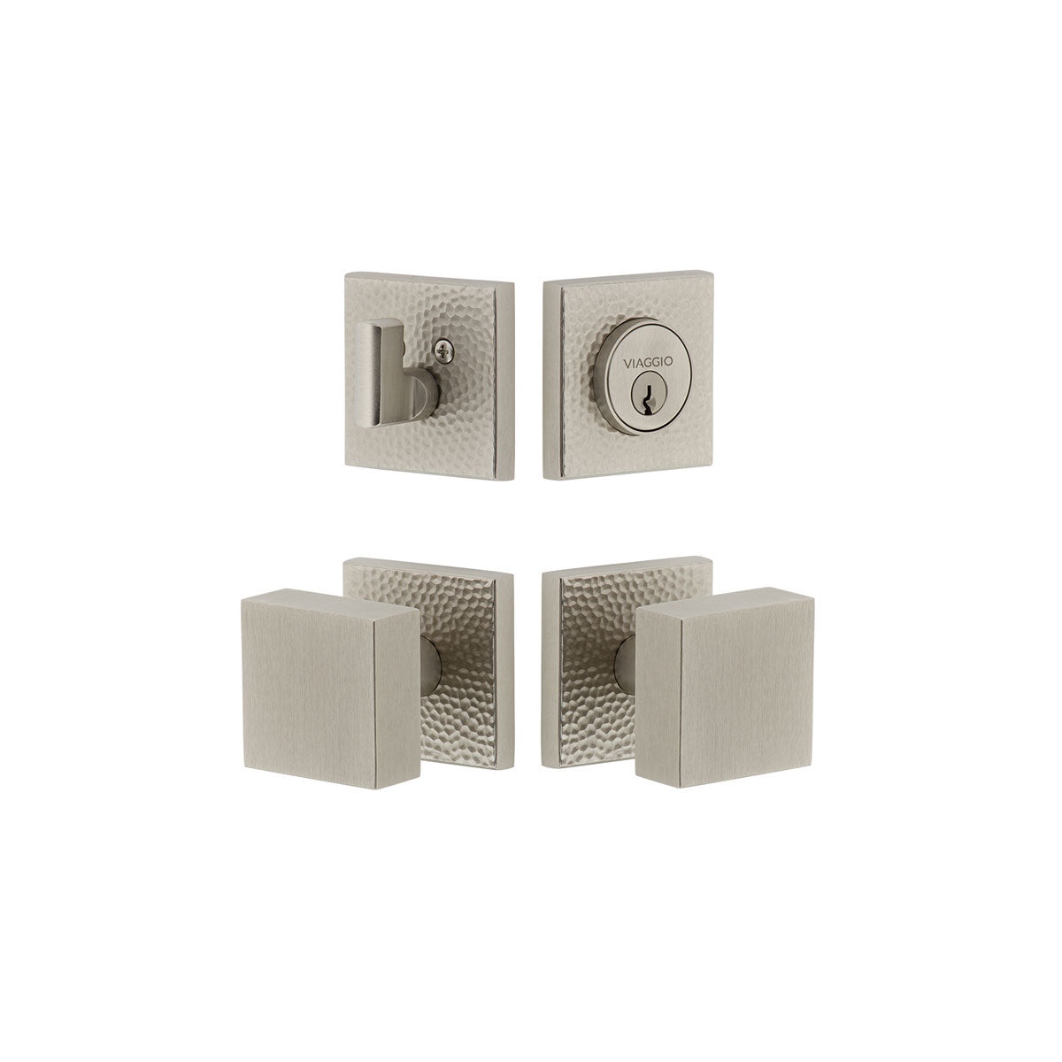 Quadrato Hammered Rosette Entry Set with Quadrato Knob in Satin Nickel
