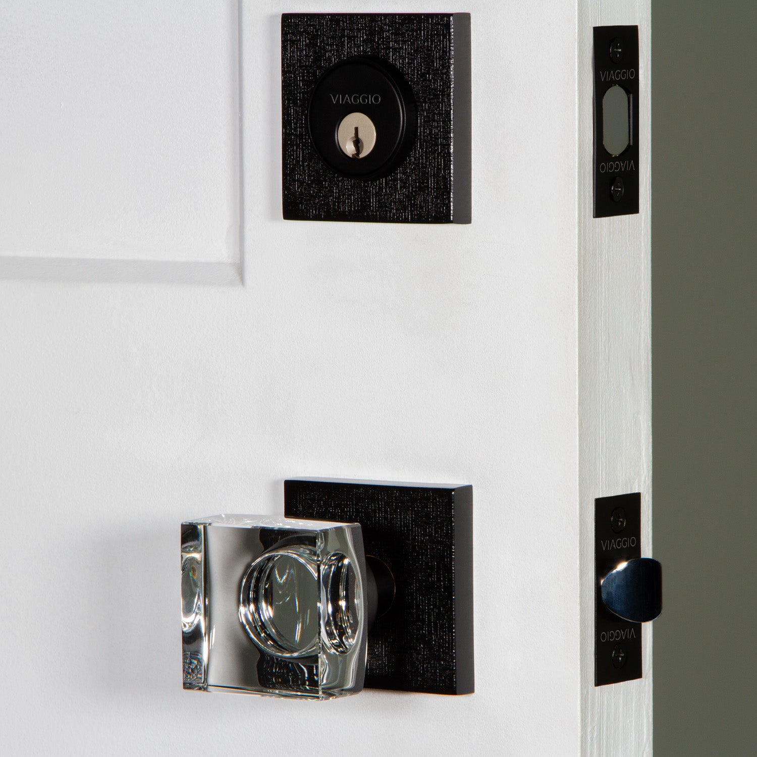Quadrato Linen Rosette Entry Set with Quadrato Crystal Knob in Satin Black