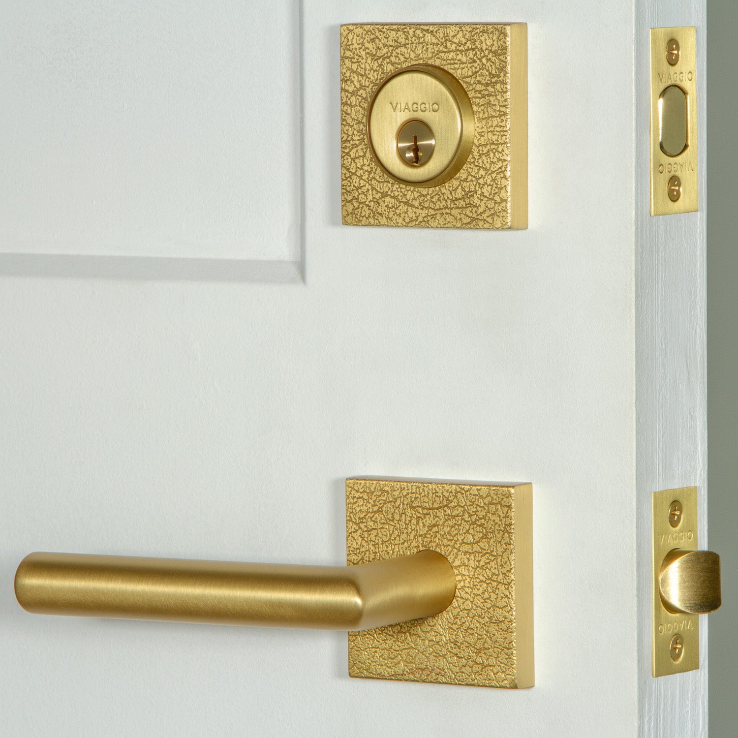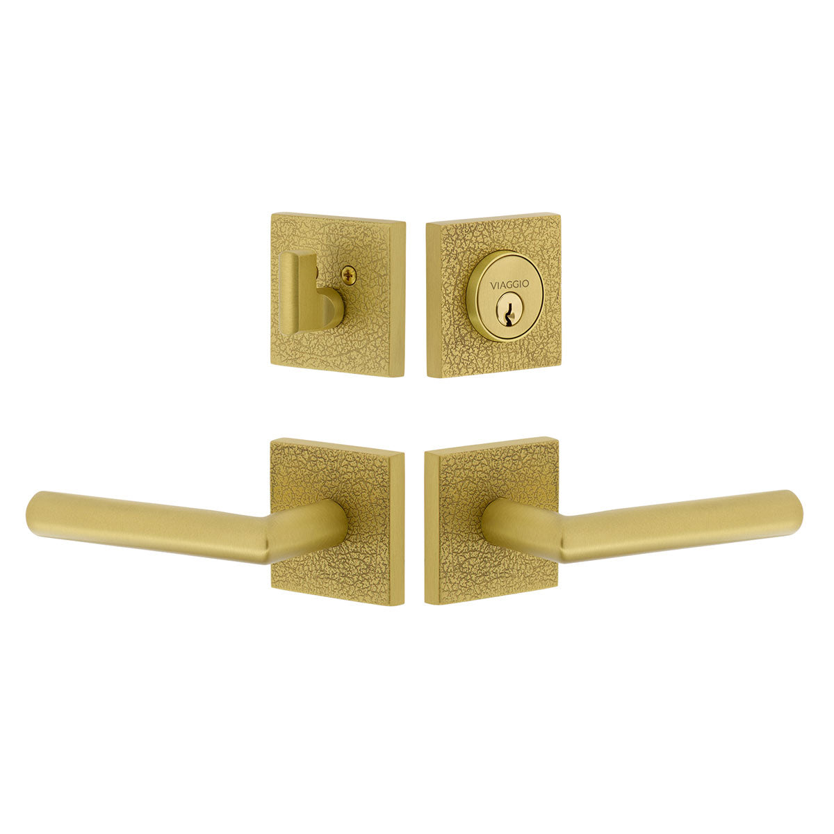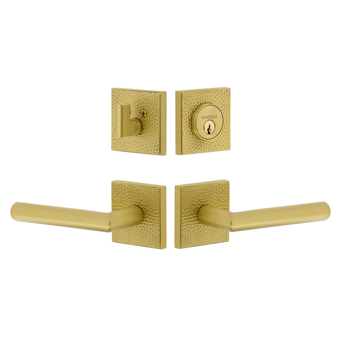Quadrato Hammered Rosette Entry Set with Moderno Lever in Satin Brass