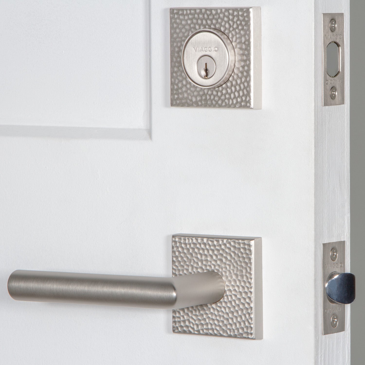 Quadrato Hammered Rosette Entry Set with Moderno Lever in Satin Nickel