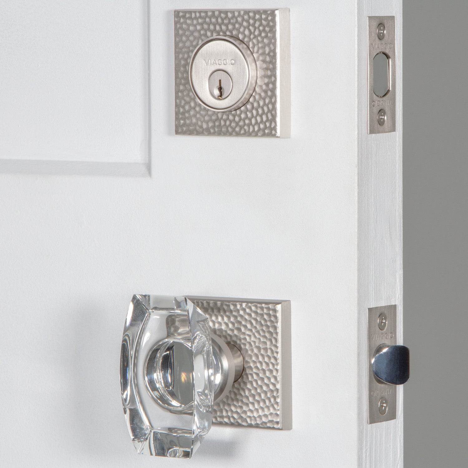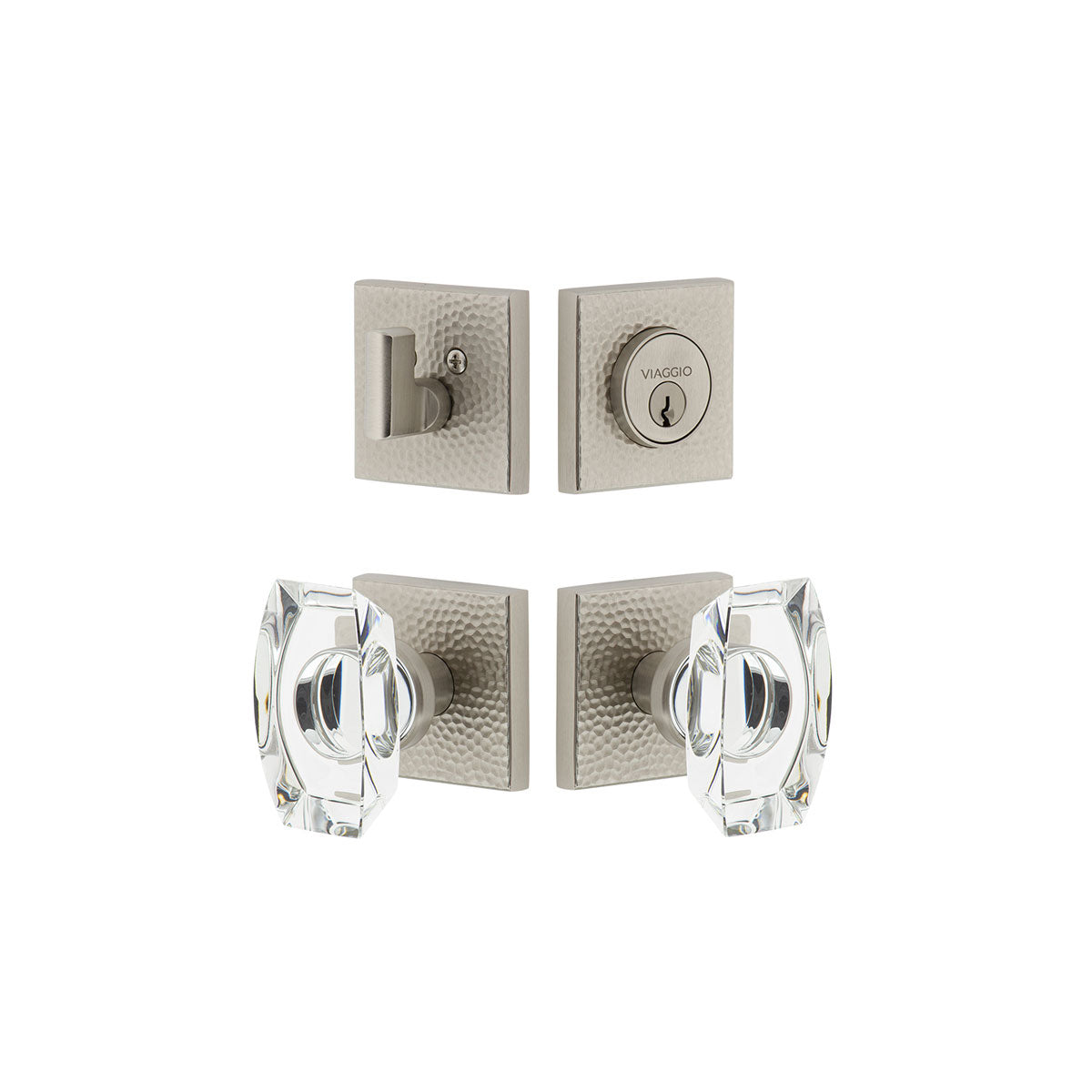 Quadrato Hammered Rosette Entry Set with Stella Knob in Satin Nickel