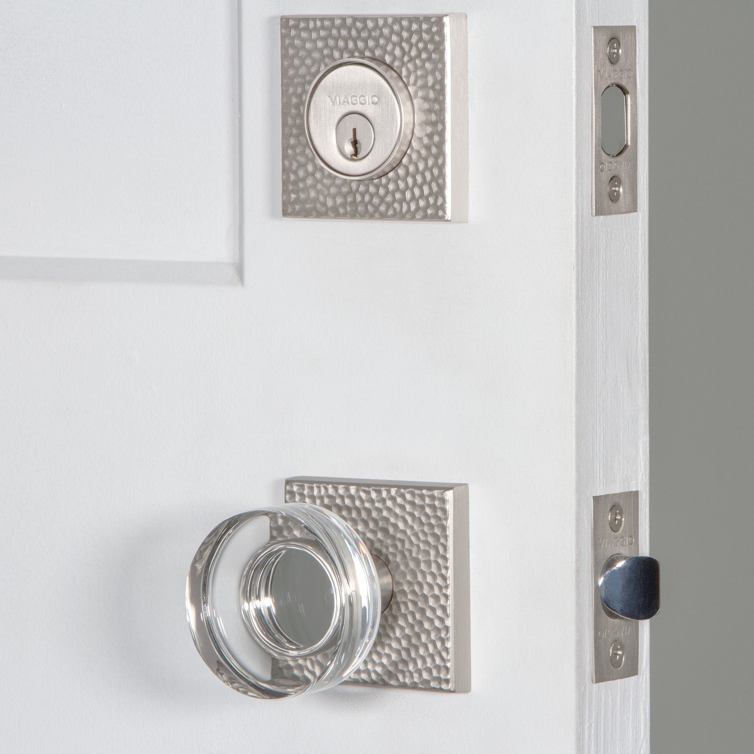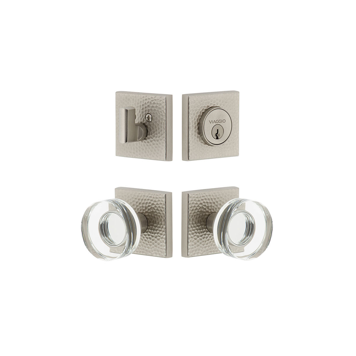Quadrato Hammered Rosette Entry Set with Circolo Crystal Knob in Satin Nickel