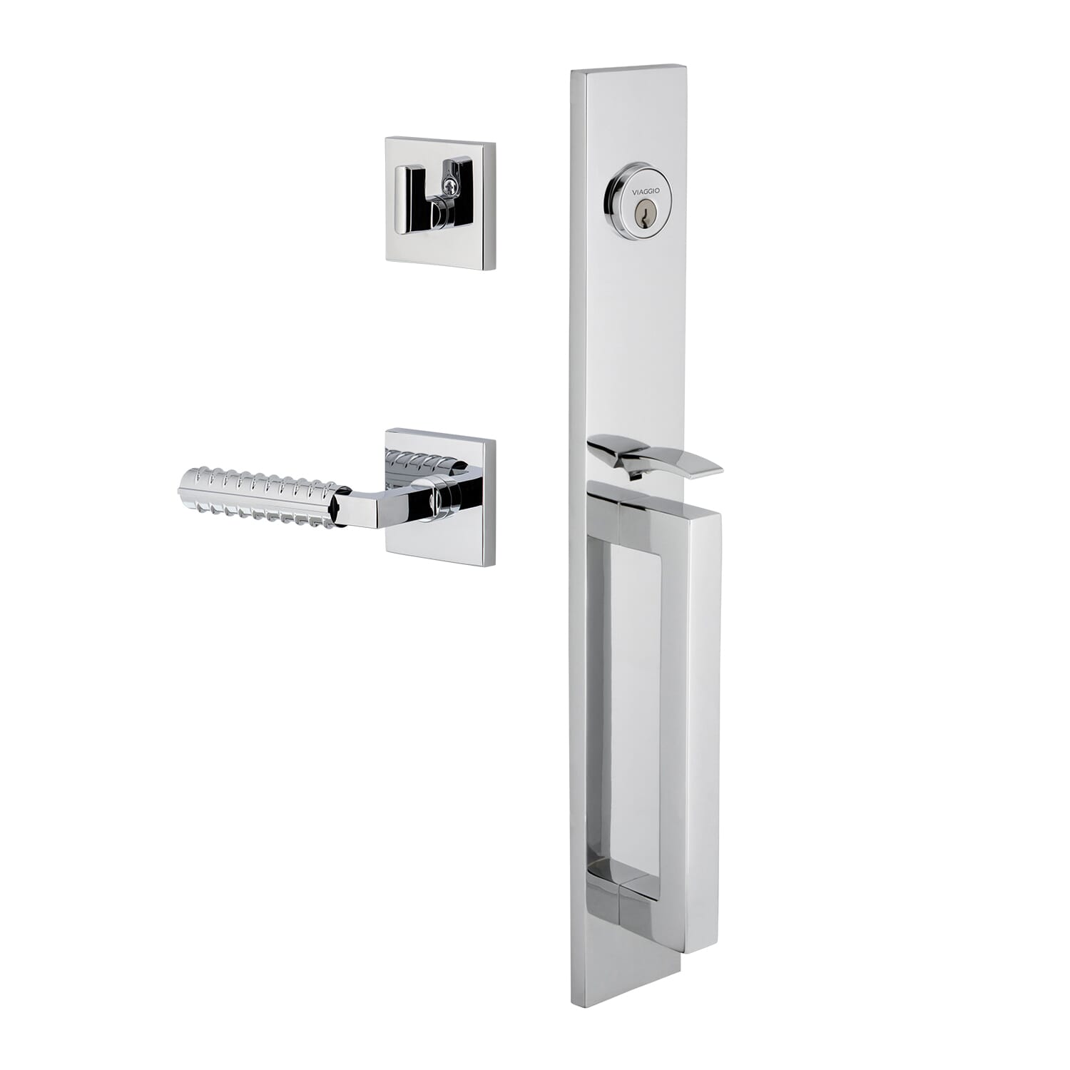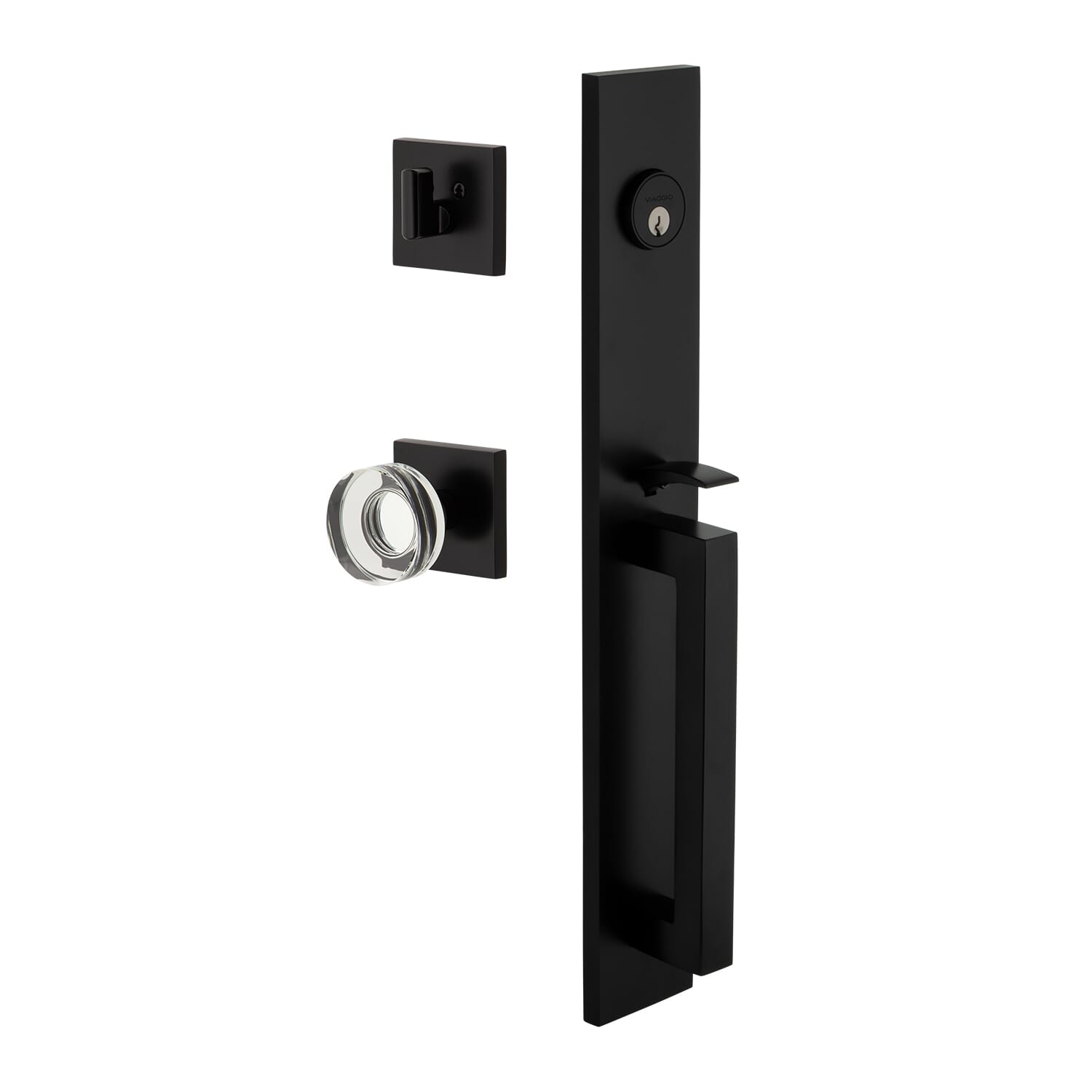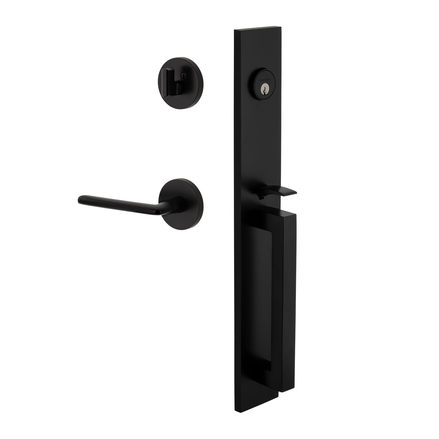 A stunning line of One-Piece Handlesets designed for modern doors. Standing an impressive nineteen inches tall, each handleset is crafted from solid forged brass for durability and elegance.With clean, sleek lines and precise geometric forms, these handlesets embody sophistication and introduce a fresh, contemporary flair to any entrance.