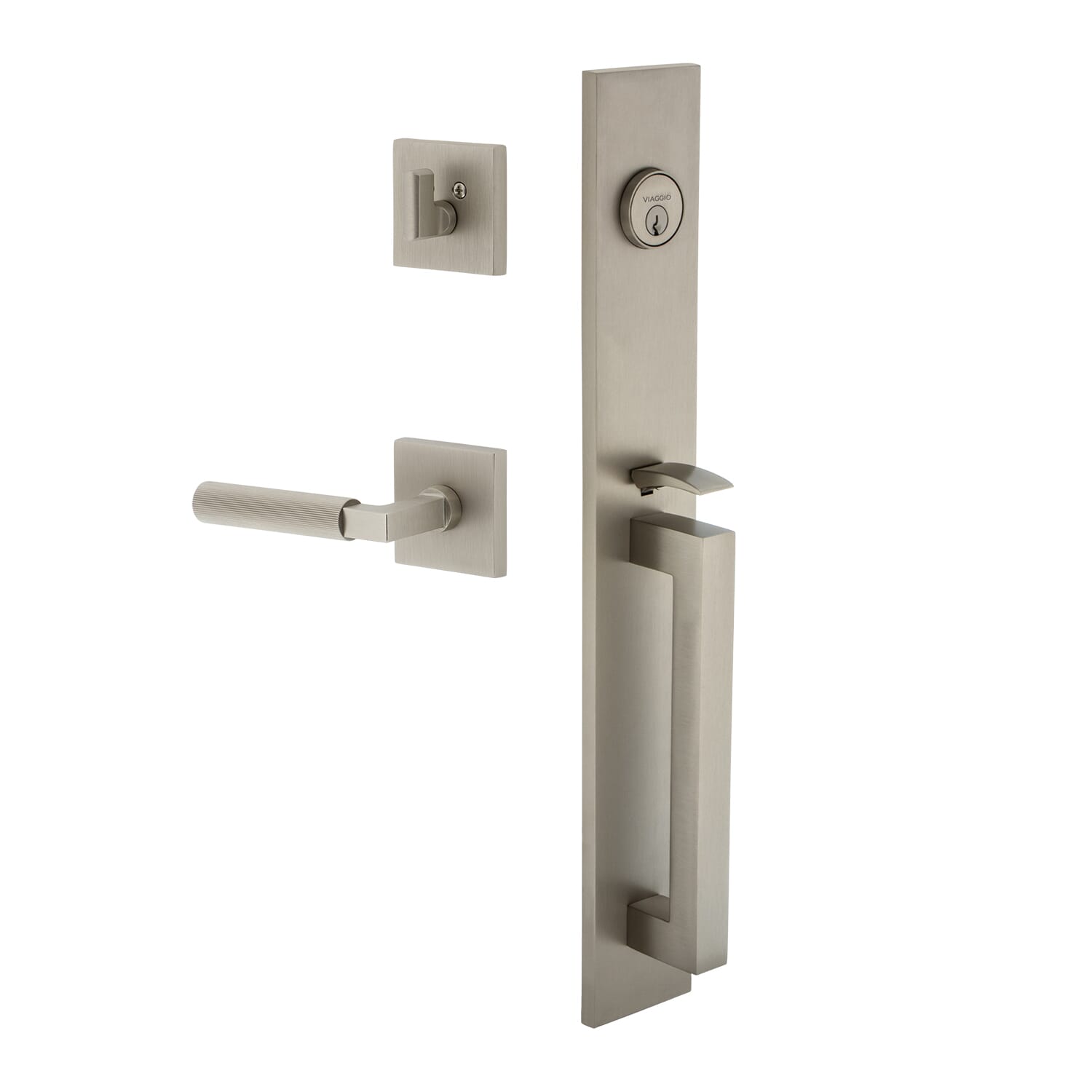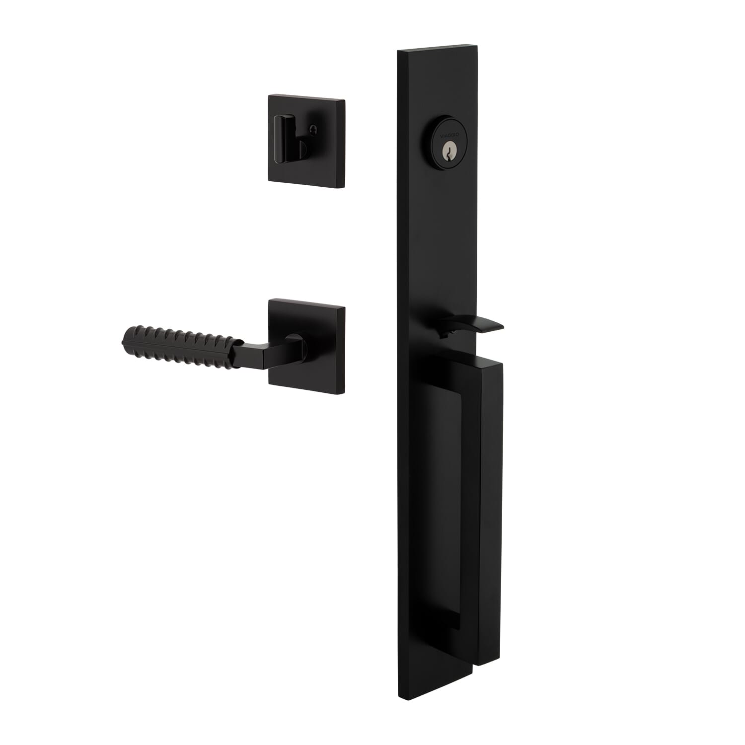 A stunning line of One-Piece Handlesets designed for modern doors. Standing an impressive nineteen inches tall, each handleset is crafted from solid forged brass for durability and elegance.With clean, sleek lines and precise geometric forms, these handlesets embody sophistication and introduce a fresh, contemporary flair to any entrance.