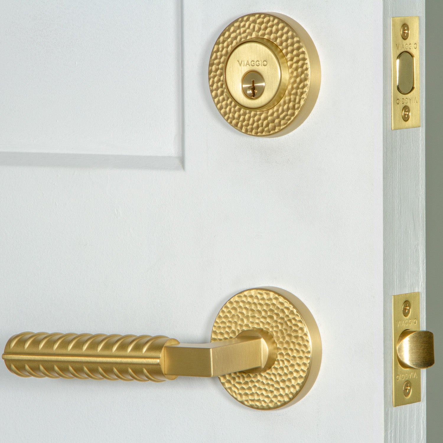 Circolo Hammered Rosette Entry Set with Contempo Rebar Lever in Satin Brass